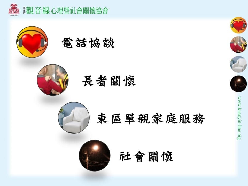 觀音線在單親及弱勢家庭的服務超過20年,服務的家庭包含家暴、外遇、離婚、喪偶,許多單親家長都是獨力撫養孩子,這個獨力撫養的壓力非常大,一般家庭會有雙親一起共同分擔經濟、教養、家務,但對單親家長來說,這些都是他們一人扛起。